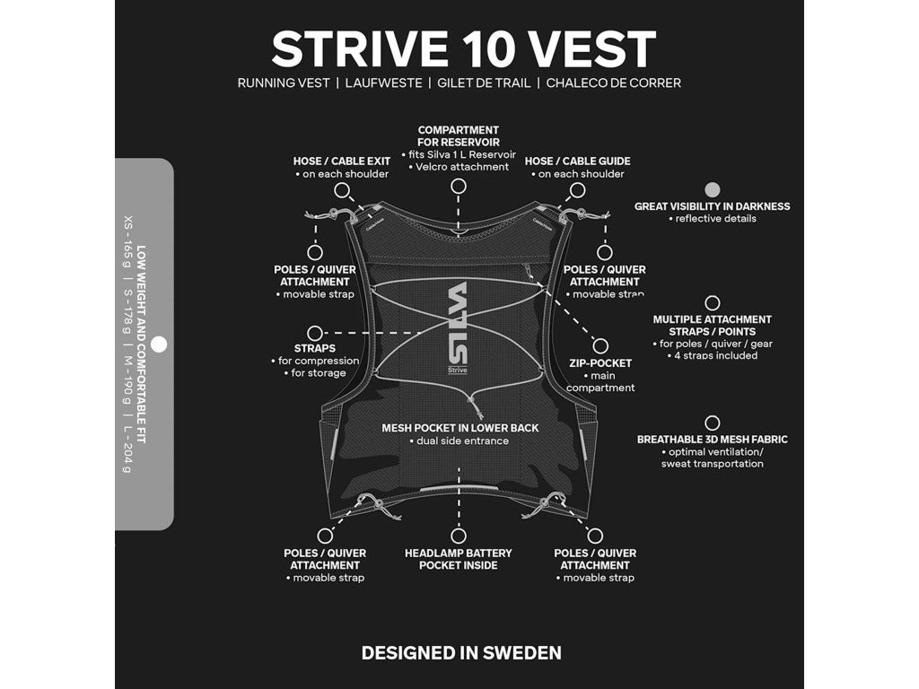 Vesta je z flexibilního ripstop nylonu s prodyšnou 3D síťovinou. Drží těsně u těla ve čtyřech velikostech. Vpředu jsou dvě lahvové kapsy s nastavitelnými pásky, dvě velké otevřené kapsy na gely nebo rukavice a dvě zipové kapsy — jedna s háčkem na klíče. Vzadu kapsa na vodní vak s vývodem hadičky na ramenou, zipová kapsa, prostorná síťová kapsa a elastická bateriová kapsa s kabelovým vývodem pro čelovku. Čtyři nastavitelné pásky drží hole, vesta je kompatibilní se systémem Strive Quiver. Reflexní prvky, integrovaná píšťalka, úchyt pro čelovku na hrudi. Lze prát ručně.