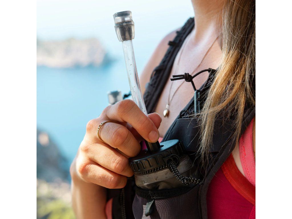 Vesta je z flexibilního ripstop nylonu s prodyšnou 3D síťovinou. Drží těsně u těla ve čtyřech velikostech. Vpředu jsou dvě lahvové kapsy s nastavitelnými pásky, dvě velké otevřené kapsy na gely nebo rukavice a dvě zipové kapsy — jedna s háčkem na klíče. Vzadu kapsa na vodní vak s vývodem hadičky na ramenou, zipová kapsa, prostorná síťová kapsa a elastická bateriová kapsa s kabelovým vývodem pro čelovku. Čtyři nastavitelné pásky drží hole, vesta je kompatibilní se systémem Strive Quiver. Reflexní prvky, integrovaná píšťalka, úchyt pro čelovku na hrudi. Lze prát ručně.